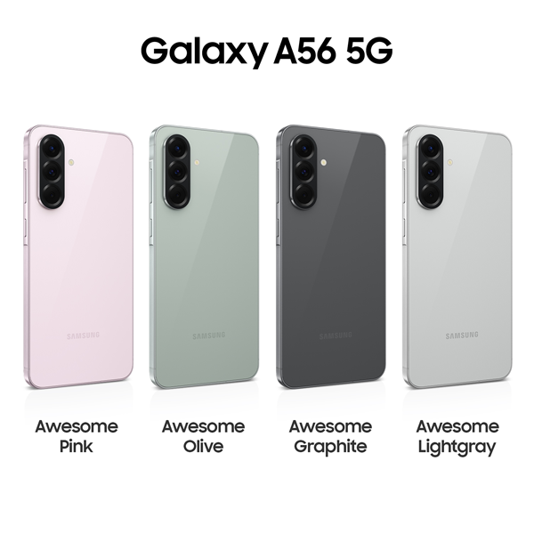Σας παρουσιάζουμε το Galaxy A56 5G. Με πάχος 7,4 mm και βάρος 198 g, το Galaxy A56 5G παρέχει άνετο κράτημα. Οι βελτιωμένες κάμερες ομαδοποιούνται για να ταιριάζουν με τη νέα γραμμική σχεδίαση. Το Galaxy A56 5G διατίθεται σε τέσσερις χρωματικές επιλογές — Awesome Graphite, Awesome Lightgray, Awesome Olive και Awesome Pink.