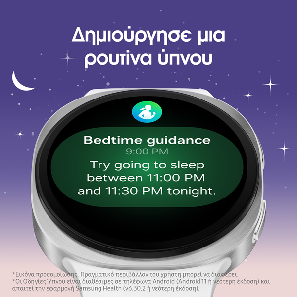 Η ωραία μέρα ξεκινάει από το προηγούμενο βράδυ. Απολαύστε ξεκούραστο ύπνο και ευχάριστα πρωϊνά! Φορέστε το Galaxy Watch8 ενώ κοιμάστε για μια εβδομάδα για να μάθετε τον τύπο ύπνου σας. Στη συνέχεια, ακολουθήστε ένα εξατομικευμένο πρόγραμμα καθοδήγησης 3-4 εβδομάδων, σχεδιασμένο για να προσαρμόσει τον ύπνο σας.